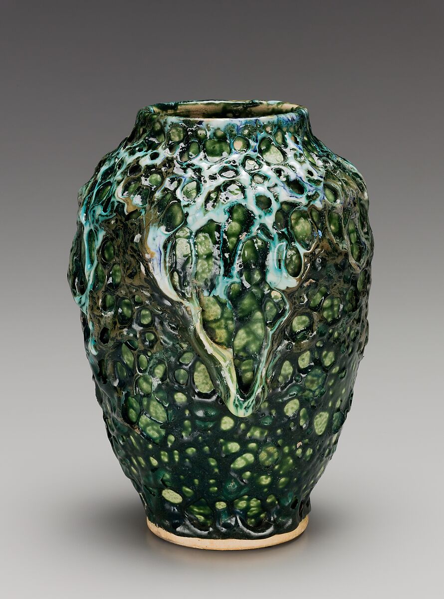 Among the most exceptional is this example, on which the thick glazes bubbled up to create dramatically textured effects that, at the time, were referred to as "lava-like." The medley of green and white glazes represented here produced a heavily cratered lunar surface. In 1898 a writer for the magazine Arts for America probably had such a vase in mind when he wrote of the Dedham Pottery: "In high-fire work the temperature ranges between 3,000 and 4,000 degrees, and the glaze applied to the top of the vase bubbles like pitch and runs down the sides, coating the surface. In this class of work it is impossible to have the effects twice alike, for at the different firings the chemical conditions vary."