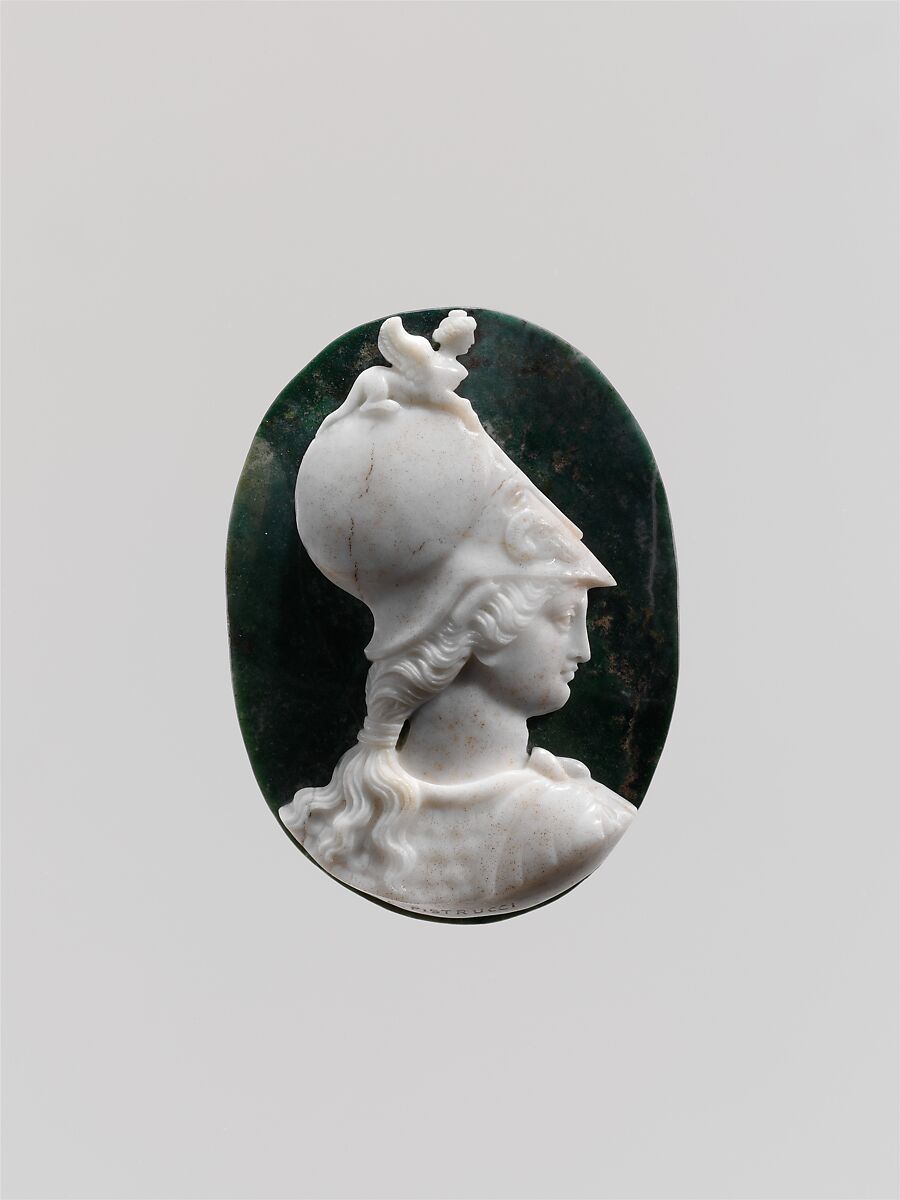 Benedetto Pistrucci’s daughters lived in Rome after his death, and it was probably there that Elena carved this cameo, basing it directly on her father’s wax-on-slate model (Museo di Roma), which he had patterned (including the ram’s head on the helmet) after an ancient statue, the Giustiniani Minerva (Vatican Museums). Elena made the goddess’s features abstractly rigid, yet the white stratum, which contrasts agreeably with the deep green ground, evokes the essence of marble.