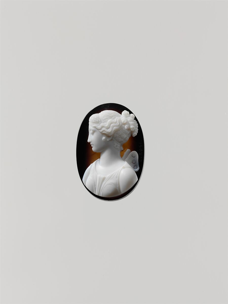 The diaphanous nature of Psyche’s butterfly wings is indicated by small circular cuts into the translucent claret-toned layer. Anticipating customers, Luigi Rosi (apparently unrecorded apart from this piece) supplied his address in the Via Rasella near the Trevi Fountain in Rome. Most Roman carvers favored locations northwest of there, in streets between the Spanish Steps and the Piazza del Popolo.