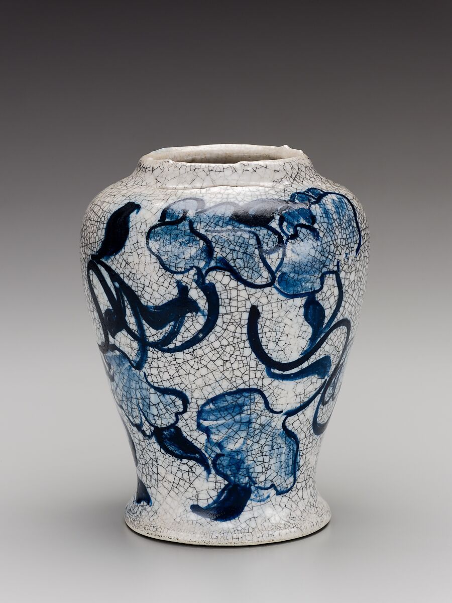As all-consuming as his pursuit of the ideal oxblood glaze was, Robertson also pioneered other glazing techniques, among them the craquelé glaze, which he first achieved in 1886. This distinctive type of glaze, with its fine network of visible cracks, was a staple of Eastern ceramics that Westerners tended not to emulate because they considered such crazing a flaw. Appreciating its aesthetic value, Robertson perfected an allover white crackle glaze often enhanced with cobalt blue decoration painted on the surface, referencing the Chinese blue-and-white ware sought by Aesthetic-minded collectors of the time.