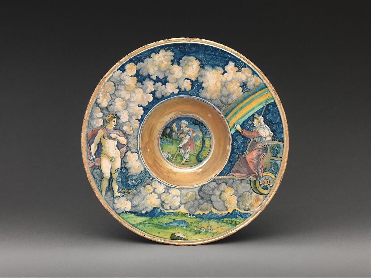 In Virgil’s Aeneid, humans are subject to the whims of the gods. This bowl belongs to a service featuring characters from the tale, and the artist ingeniously used the bowl's divided surface to depict the dual realms of heaven and earth. Humans are restricted to the deep central well, and gods to the broad, flat rim. Here, the mortal Anchises leans on his staff, while divine Juno and Aeolus are pictured among the clouds.