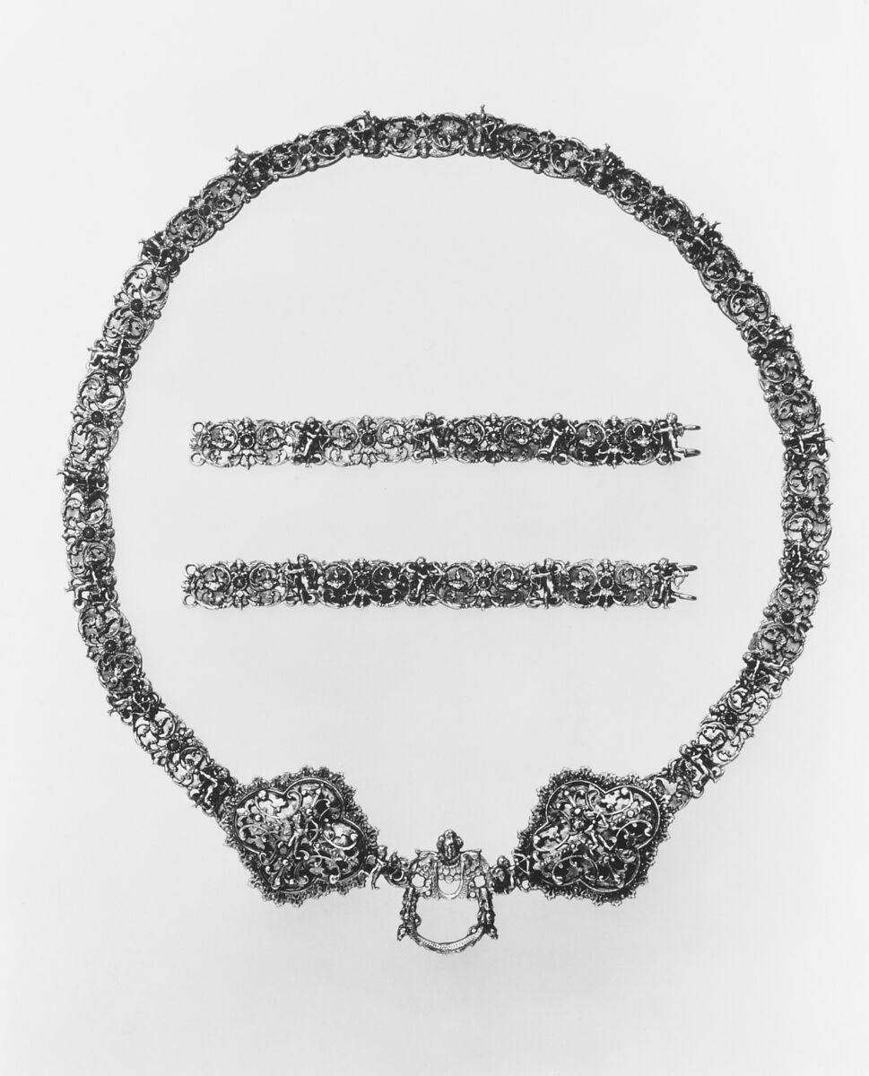 Purses, rosaries, prayer books, and other small accessories were hung from girdles, which were often given as wedding gifts. The girdle and its two extensions feature the same decorative scheme of cast cupids and foliated scrolls.