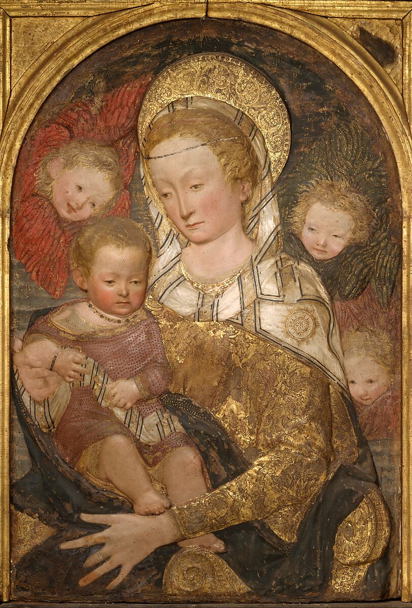 After this relief had been molded in stucco (a form of plaster), it was sent to another artist’s workshop to be painted. The collaboration between sculptor and painter creates lifelike effects: Christ’s plump cheeks project into space and are flushed like those of a real child. However, the sparkle of gold - on the throne, in Mary’s hair, and the angels’ wings - underscores the scene’s heavenly nature.
