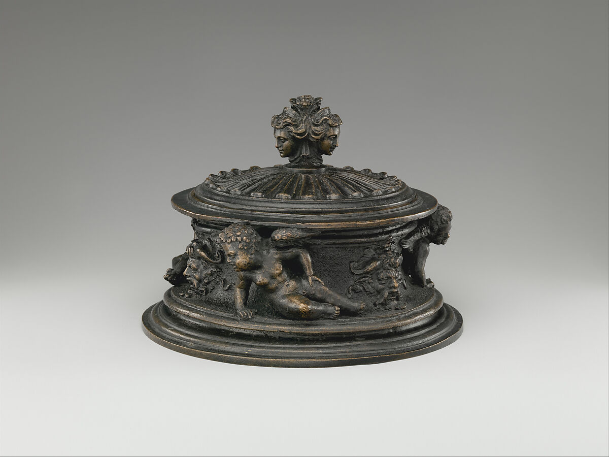 The unusual receptacle has the shape of a low, round cylinder with a gadrooned lid and a handle formed of three female heads attached to each other at their backs. The vessel’s drumlike body has several moldings of different diameters on top and bottom and, between the moldings, a concave frieze decorated with three male masks alternating with three reclining putti. The latter, modeled almost in three dimensions, rest on their right sides supported by their arms, their tiny hands gripping the lower rim of the container, while their left hands are placed akimbo on their left hips. The little wings are fitted below the upper rim, and the heads look with a slightly troubled expression to the left. All three putti are rendered in the same pose but seem to be modeled individually. The masks show a bearded male face with fleshy nose, heavy, contracted brows, leaflike ears, and twisted horns growing from the temples under a wild mane. Their mouths are open as if shouting, and one wonders if this is the reason the putti look at them, almost as if annoyed that they have been awakened from a restful sleep.