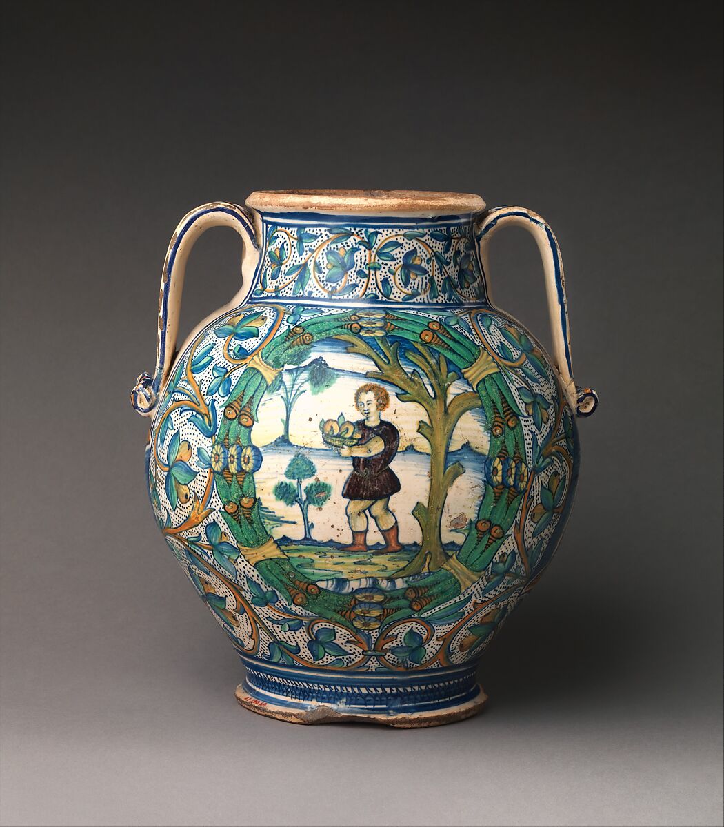 Storage vessels were among the most frequently produced maiolica wares in late medieval and Renaissance Italy. Made in fairly standard shapes, they were designed to fit with dozens of others on a shelf, often in a pharmacy or shop. Their handles therefore tend to fit within the vessel’s profile, and the cylindrical albarello type is generally narrower at the middle than at the top or bottom, making it easy to grip. Other common features include inscriptions indicating contents and flanged lips to help secure cloth or paper seals. The decoration, usually more elaborate on one side than the other, can sometimes link pieces to a known dispensary or specific workshop or artist.