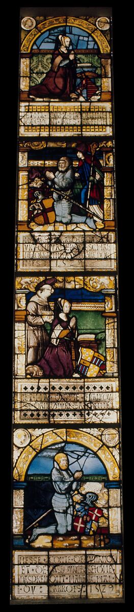His coat of arms, crest, and helmet displayed prominently before him, Hesse de Linange kneels in prayer against a patterned cloth with a bejeweled green border. His wife, Madeleine de Grandpré, is portrayed in a similar setting and pose. Hesse de Linange commissioned the panels and their counterparts on the opposite wall, depicting his relatives and their patron saints, for the chapel of the church of the Franciscan convent of the Soeurs Grises in Ormes-et-Villes, Lorraine.
