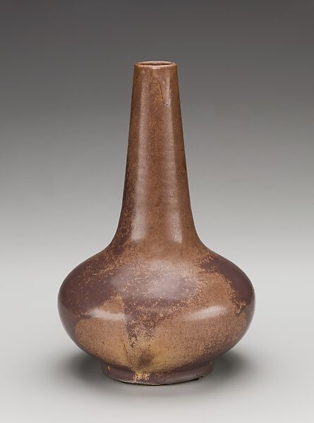 Charles Fergus Binns was one of the most influential ceramic educators in the United States. Trained in England at the Royal Worcester Porcelain Works in Staffordshire, he came to this country in 1897. By that time, he had already published and lectured widely on ceramics. He played a pivotal role as an educator, heading the New York State School of Clay-Working and Ceramics (now the New York State College of Ceramics at Alfred University), the first American institution to grant a degree in ceramics. Binns taught ceramic technology, offering instruction in clay bodies and glaze chemistry. Among his most notable students were Arthur Baggs of the Marblehead Pottery, Frederick Walrath, Adelaide Robineau, and Mary Chase Perry. At Alfred Binns explored a range of glazes, including traditional gloss finishes, but he particularly favored matte glazes. This relatively large vase, among the earliest extant examples of his work, is representative of Binss disdain for surface decoration in his personal work, relying instead on the vessel’s form and glaze of its aesthetic effect. Its refined stoneware body is of a type introduced at the school in 1903, one that Binns used throughout his career. The vase’s elegant Chinese shape is a form that the ceramics preferred during his first decades at Alfred. Also inspired by Eastern traditions, the matte glazes—a dark brown dripping over a soft, lighter brown—reflect the admiration many American art potters then had for Asian aesthetics.