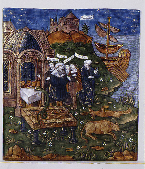 European of the Renaissance period viewed ancient Rome not only as the origin of Italian civilzation but also the geographic center of a lost golden age. This plaque belongs to a series of at least eighty Limoges enamels illustrating events from Virgil’s Aeneid. The Latin epic poem tells the story of the legendary hero Aeneas, who escaped the sack and burning of Troy by the Greeks and, after wandering for some time, settled in Italy, where his descendants founded Rome.