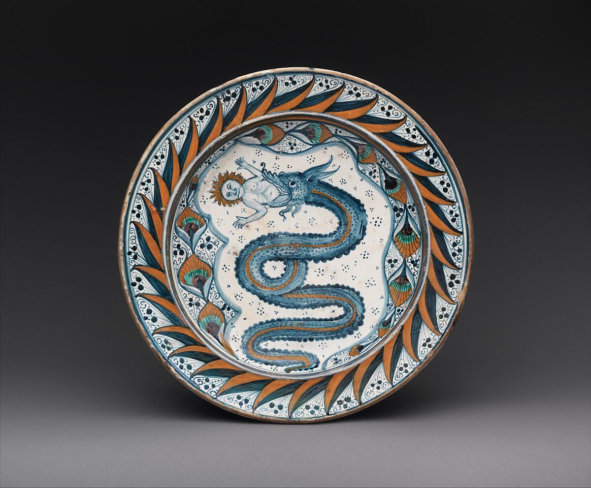 Here, a dragon-headed creature devours a somewhat complacent-looking boy. This startling image, known as the biscione (big serpent), was a heraldic symbol of the ruling family of the duchy of Milan. Filling much of the dish’s central well, it is surrounded by an irregular border of peacock feathers. Two holes in the foot ring allowed the dish to be suspended on the wall, where it would be viewed as a bold statement of Milanese allegiance.