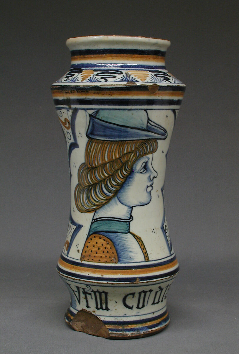 Storage vessels were among the most frequently produced maiolica wares in late medieval and Renaissance Italy. Made in fairly standard shapes, they were designed to fit with dozens of others on a shelf, often in a pharmacy or shop. Their handles therefore tend to fit within the vessel’s profile, and the cylindrical albarello type is generally narrower at the middle than at the top or bottom, making it easy to grip. Other common features include inscriptions indicating contents and flanged lips to help secure cloth or paper seals. The decoration, usually more elaborate on one side than the other, can sometimes link pieces to a known dispensary or specific workshop or artist.