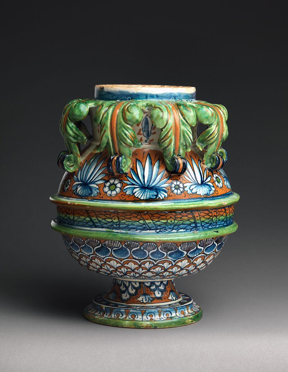 This playful vessel takes an unusual form. The green fronds are impractical as handles, and the continuous decoration—unnecessary if the pot were intended for storing goods on a shelf—suggests that it was meant to be seen in the round. The original function of this piece therefore remains open to debate, but it was perhaps better suited to displaying cut flowers. Renaissance paintings show maiolica vessels used in this way.