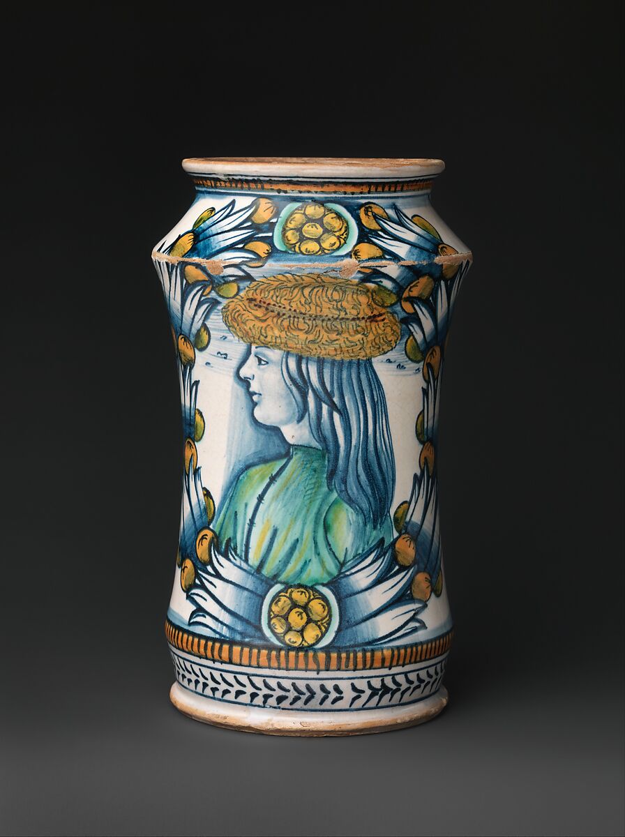 Storage vessels were among the most frequently produced maiolica wares in late medieval and Renaissance Italy. Made in fairly standard shapes, they were designed to fit with dozens of others on a shelf, often in a pharmacy or shop. Their handles therefore tend to fit within the vessel’s profile, and the cylindrical albarello type is generally narrower at the middle than at the top or bottom, making it easy to grip. Other common features include inscriptions indicating contents and flanged lips to help secure cloth or paper seals. The decoration, usually more elaborate on one side than the other, can sometimes link pieces to a known dispensary or specific workshop or artist.