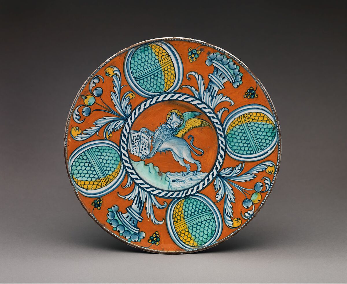 This plate was made in Umbria for the Venetian market, and is decorated with the arms of the city – the Lion of St. Mark with an open book inscribed PAX TIBI MARCE EVANGELISTA MEUS (Peace be with you, Mark, my Evangelist).