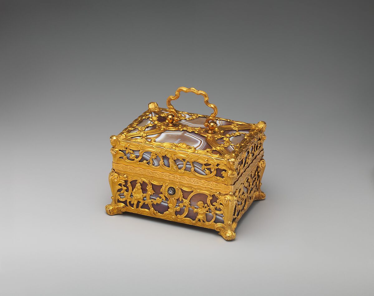 Elegant nécessaires de poche filled with minute utensils for grooming, writing, or sewing were fashionable during the eighteenth century. Made of gold with hard stones, mother-of-pearl, or tortoiseshell, they were the work of a goldsmith and often served as New Year’s presents. Here, an openwork pattern of scrolls, floral garlands, small animals, birds, and dancing musicians in gold is placed on panels of striated agate. The original contents of the nécessaire are missing.