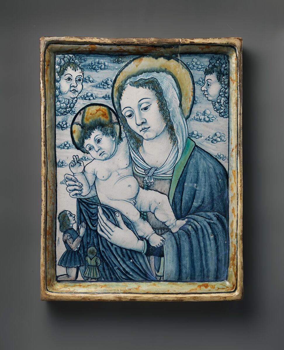 Unlike many maiolica objects, this plaque has no function beyond displaying a painted image to the viewer. It retains the sense of domesticity associated with Renaissance maiolica vessels and tableware, but was made to encourage religious devotion. . The small format and tightly cropped view of the Virgin and Child create an intimate relationship with the viewer, and the small kneeling donors at lower left present a model for worship in the home. The plaque imitates fifteenth-century panel painting and relief sculpture in both subject and form and even includes an integral frame.
