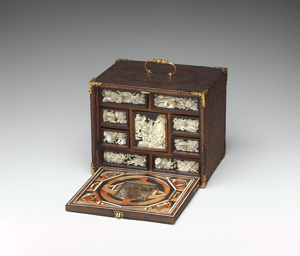 Tailored to the taste of the European courts, these two small cabinets embody the diversity and complexity of the objects found in sixteenth- and seventeenth-century Kunstkammern. The miniature cabinet (48.59.2), encased in a finely gilded leather, was a gift from the Nuremberg town council to an important visitor, possibly a Habsburg, given the presence of the coat of arms of Albert VII, Archduke of Austria and ruler of the Habsburg Netherlands.[1] Trophies of arms and musical instruments decorate the drawer fronts, while the central door panel is based on a 1559 woodcut by Bernard Salomon.[2] The drop-down lid divulges a marquetry inlay of six skeletal (durchsichtigen) corpora, executed in perspective to resemble late sixteenth-century designs by Wenzel Jamnitzer and Lorenz Stoer.[3] Drawn from a vibrant print culture, decorative objects dis-playing variations on the Platonic solids were exported across the continent, presenting the fruits of artisanal experimentation with geometry to wealthy patrons intent on coveting, and displaying, the new and wondrous.