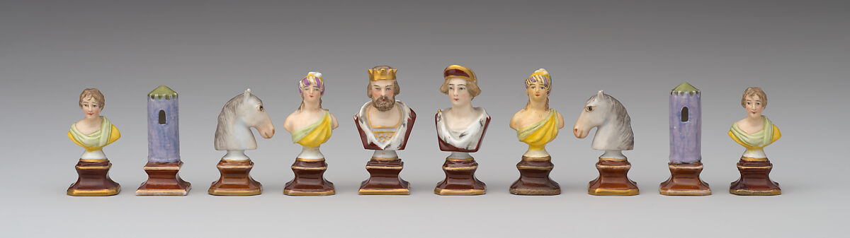 The sides are distinguished by the hair color of the figures, blonde or brunette, and the bases, which are enameled on the blonde side, left white on the brunette side. The set is quite practical, and apart from the subject of its opposition is rather conventional in its major pieces. The king, queen, knight, and rook are in no way unusual; the bishops, however, are ladies, which is not customary. The set was made at the Royal Berlin Porcelain Factory.