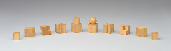The sphere, double cube, and three sizes of block, singly or combined, yield pieces that, despite their highly geometric stylization, are strongly suggestive of their rank or power. The bishops are clearly implied by the cross outline, and the rooks by the simple stablility of a cube. Most ingenious of all are the knights, formed of three double cubes joined in such a fashion that each face of the resulting form shows two cubes one above the other and a third on the side, an embodiment of the knight's move.