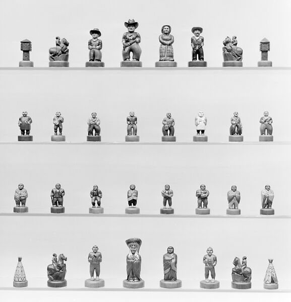 The set is one of many that illustrate domestic incidents in national history. The subject, presumably the contest beween American Indians and American whites, shows a number of inconsistencies. For example, no such white "cowboy" types fought in such lookouts against American Indians. The crude workmanship and the naivité displayed here make a set like this the opposite of European nineteenth-century "historical" sets, with their careful revival of past ages. Each piece has the engraved signature LEACH on the base.
