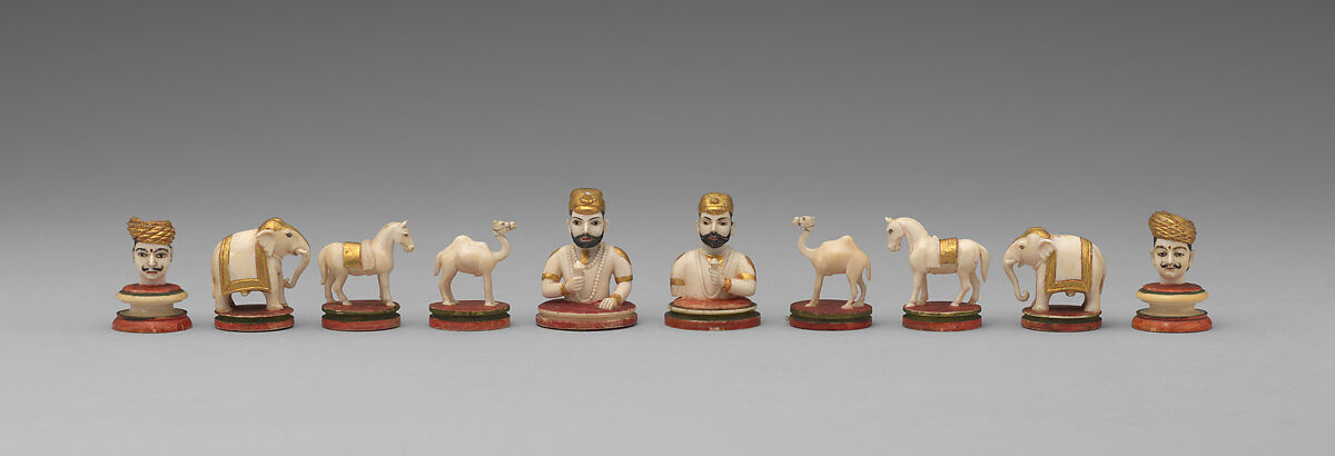 The pawns, human male heads wearing turbans, have red and green forehead marks to match their bases. All the pieces are figural, and the arrangement—the king and minister being male half-figures, the bishop a camel, the knight a horse, and the rook an elephant—is exceedingly common in Indian chess.