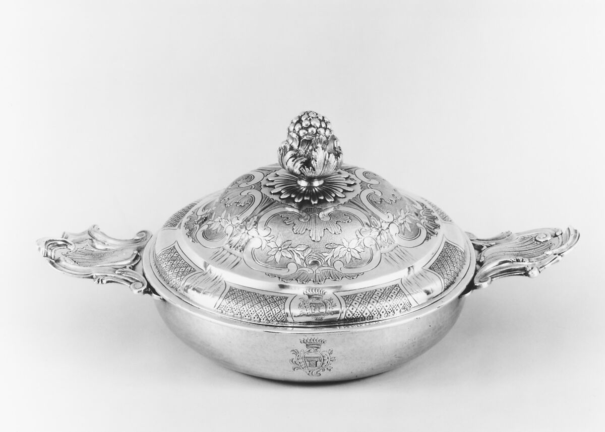 From the mid-18th century until ca. 1770, the profile of the écuelle cover changed and became somewhat bell shaped, as in this example. Made in Toulouse in 1759, the rococo style is evident in the pomegranate knob handle on the cover and the asymmetrical decoration of the handles of the bowl.