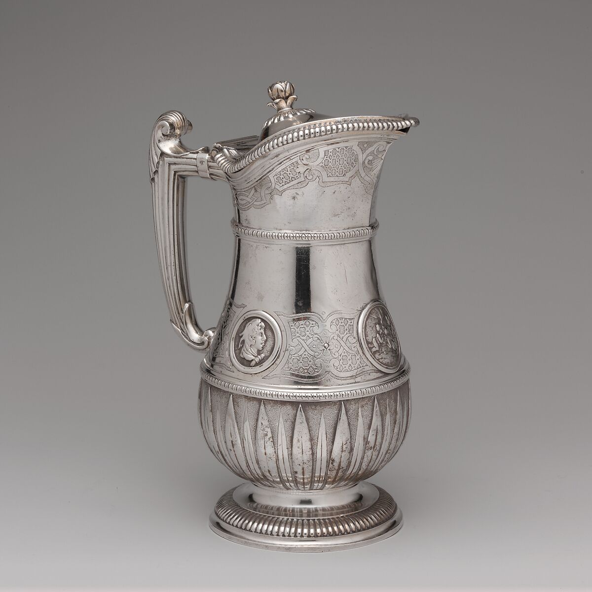 Here, amidst the strapwork decoration influenced by the designs of Jean Berain, and the cut-card work, is another fashionable device. Small cast medallions with the heads of Roman men and women in profile as well as figures of putti are applied on both the ewer and the basin.