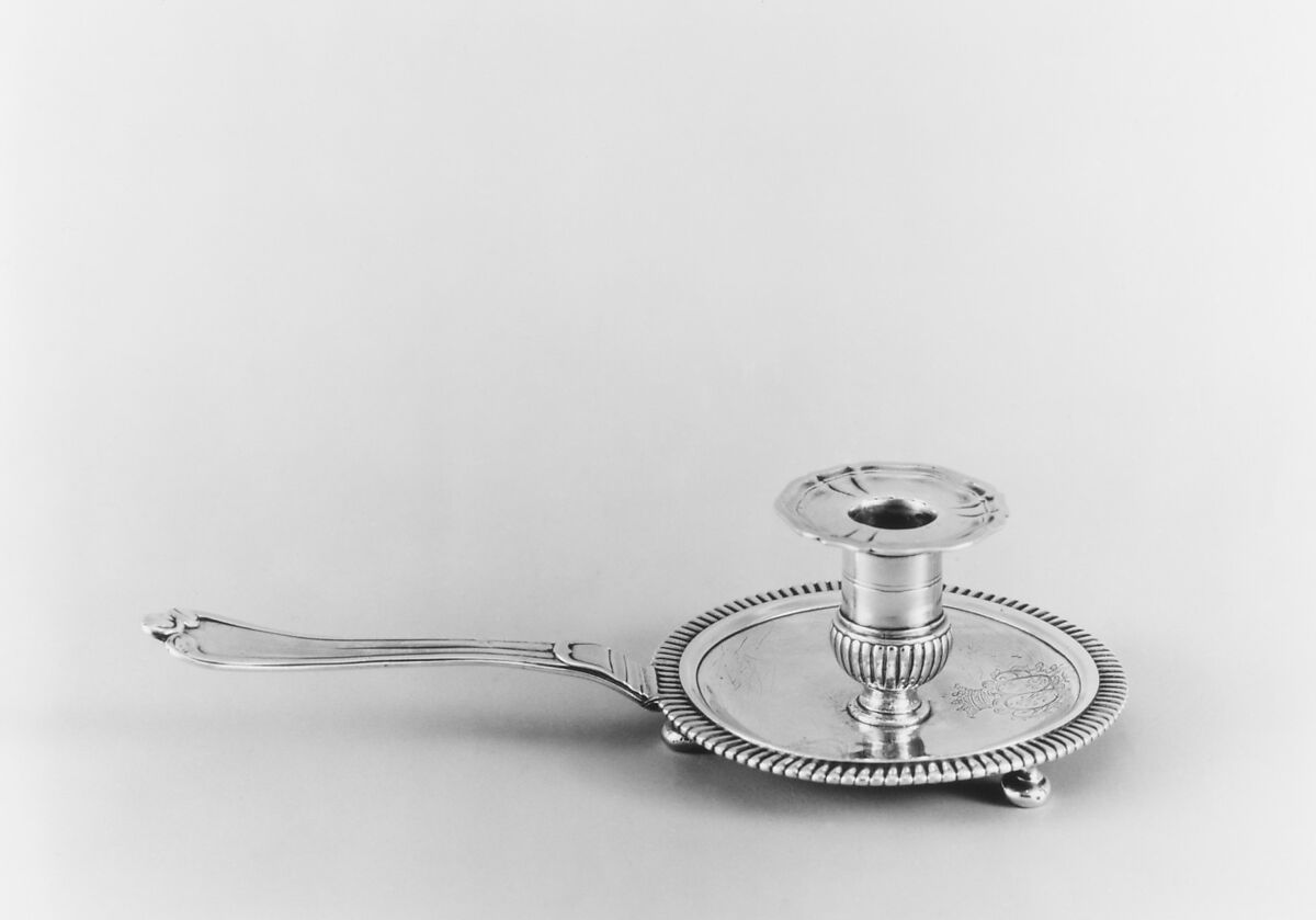 Hand or chamber candlesticks were designed to be portable for carrying around the house to light one’s way to the bed chamber. This eighteenth-century example is supported on three knob feet, it has a straight spoon-type handle, the socket is partially gadrooned and the round wax pan has a gadrooned edge.