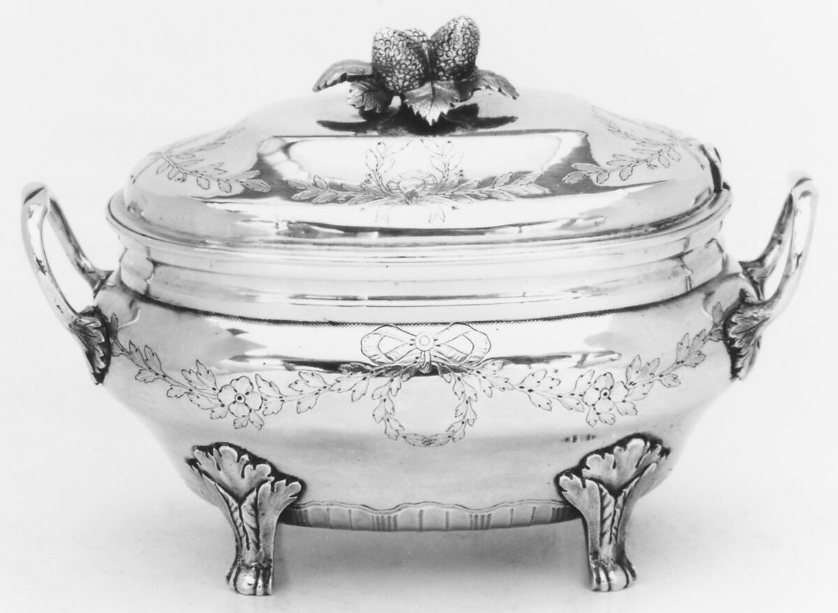 By the middle of the 18th century, sugar bowls in the form of small, lidded tureens became fashionable. Presumably, this diminutive vessel would have had a matching tray, now missing. The bowl and cover are chased with floral swags, wreaths and bowknots of ribbon, all indicative of the neo-classical style. The finial is formed by a cluster of strawberries, their sweetness indicates the tureen’s function as a container for sugar. This sugar bowl was made by the Paris silversmith Louis-Joseph Bouty in 1785-87.