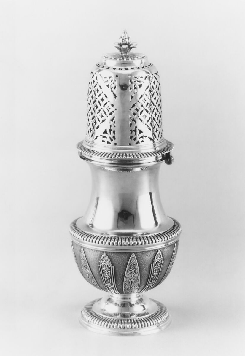 The early cylindrical form of the sugar caster with a pierced domed lid surmounted by a finial or knob, gave way in the eighteenth century to a more elegant baluster shape. The ornate openwork of the lid allowed the sugar to be sprinkled (saupoudroir) or “cast.” This example by the silversmith Ferdinand Lachèse of Angers, dates to 1740–42.