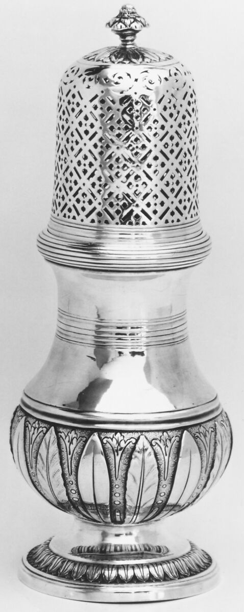 The early cylindrical form of the sugar caster with a pierced domed lid surmounted by a finial or knob, gave way in the eighteenth century to a more elegant baluster shape. The ornate openwork of the lid allowed the sugar to be sprinkled (saupoudroir) or “cast.” This example by the silversmith Pierre Belleville of Montpelier, dates to 1739-40.