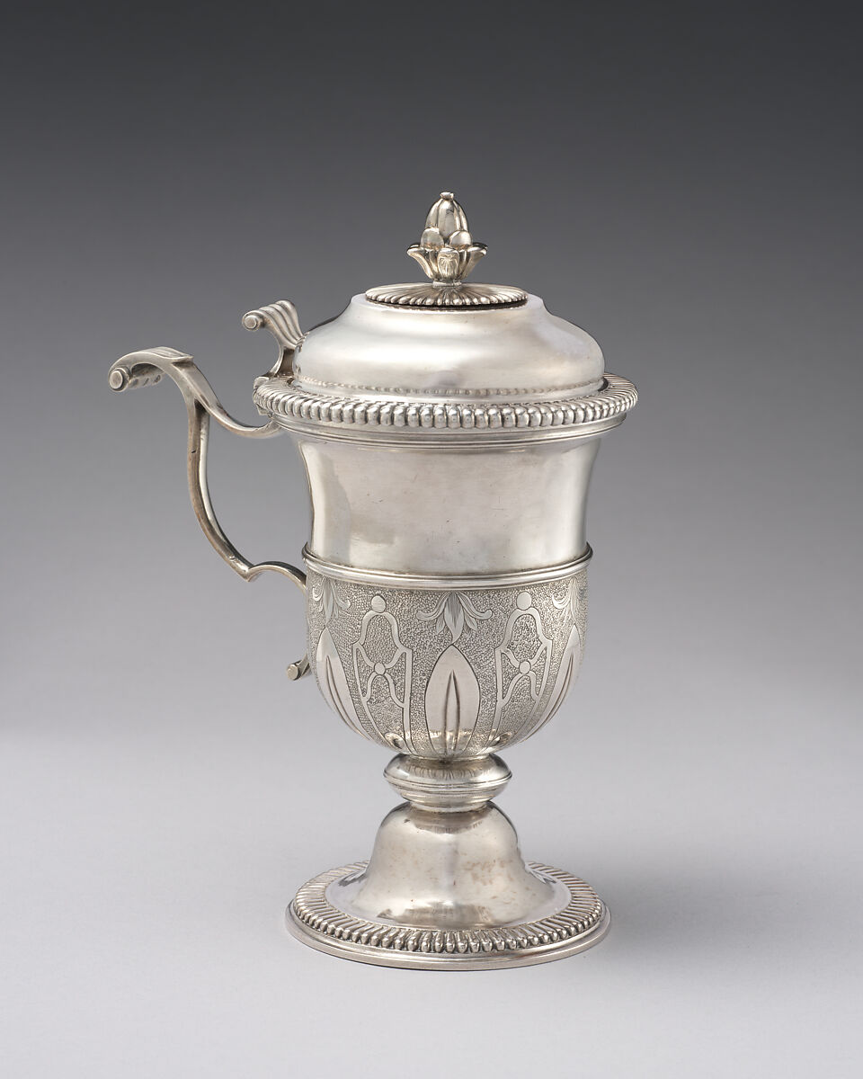 During the eighteenth century, mustard was served at the table either as a dry powder or mixed with vinegar to form a paste or sauce. The dry powder was contained in a caster left un-pierced or fitted with a removable sleeve that blocked the holes. Most of the mustard pots in the Museum’s collection were made to serve the condiment mixed into a sauce; they take the form of a small jug barely distinguishable from a lidded milk jug with a spout. Some lidded pots have an opening to accommodate a small spoon.