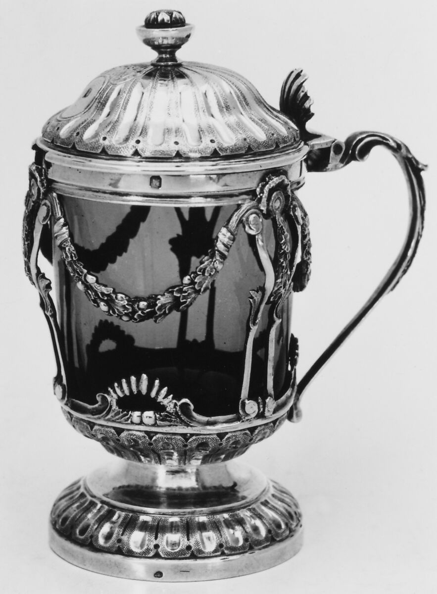 The early eighteenth-century pots are cylindrical in shape, often with typical cut card decoration and applied lambrequins. By the 1740s, the rounded shapes of the Rococo with swirling forms and floral ornament predominate. During the neoclassic period mustard pots frequently take the form of a silver open-work frame decorated with typical antique motifs with a blue glass liner as seen here.