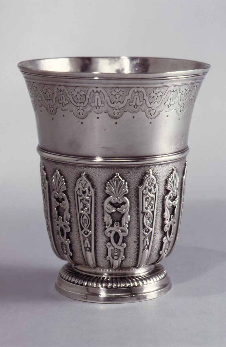 Bell or tulip-shaped beakers became the dominant form used throughout France in the first half of the eighteenth century. The decoration frequently consists of Berain-type strapwork, either in relief or engraved, lambrequin engraving around the rim, and gadrooning on the foot.