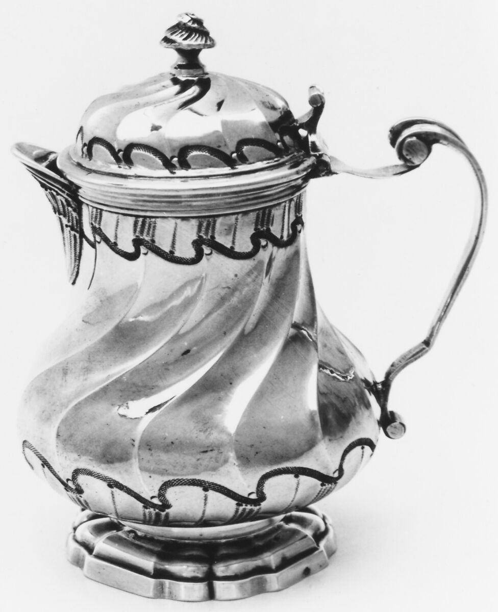 The early eighteenth-century pots are cylindrical in shape, often with typical cut card decoration and applied lambrequins. By the 1740s, the rounded shapes of the Rococo with swirling forms and floral ornament predominate as seen in this example. A mustard pot of a very similar design by the same maker Alexis Micalef, but of silver gilt, is also in the Met’s collection (48.187.187).