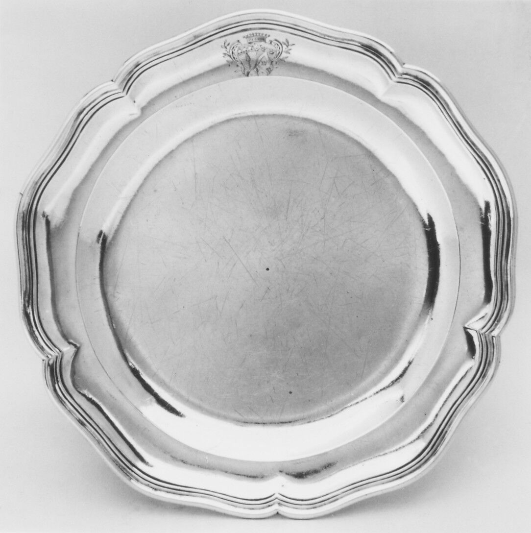 Serpentine borders are common on dinner plates from the middle decades of the eighteenth century, consistent with the Rococo penchant for curving lines. The addition of molded or gadrooned borders further enlivened the plates. If the dinner plates are embellished with the owner’s coat of arms (which are sometimes added later or engraved over earlier armorials that had been erased), they tend to be engraved on the rim to avoid abrasion by repeated scraping of knives and forks. As the eighteenth century progressed, porcelain and other ceramic dinner services became increasingly popular; however, the silver dinner service never lost its prestige.