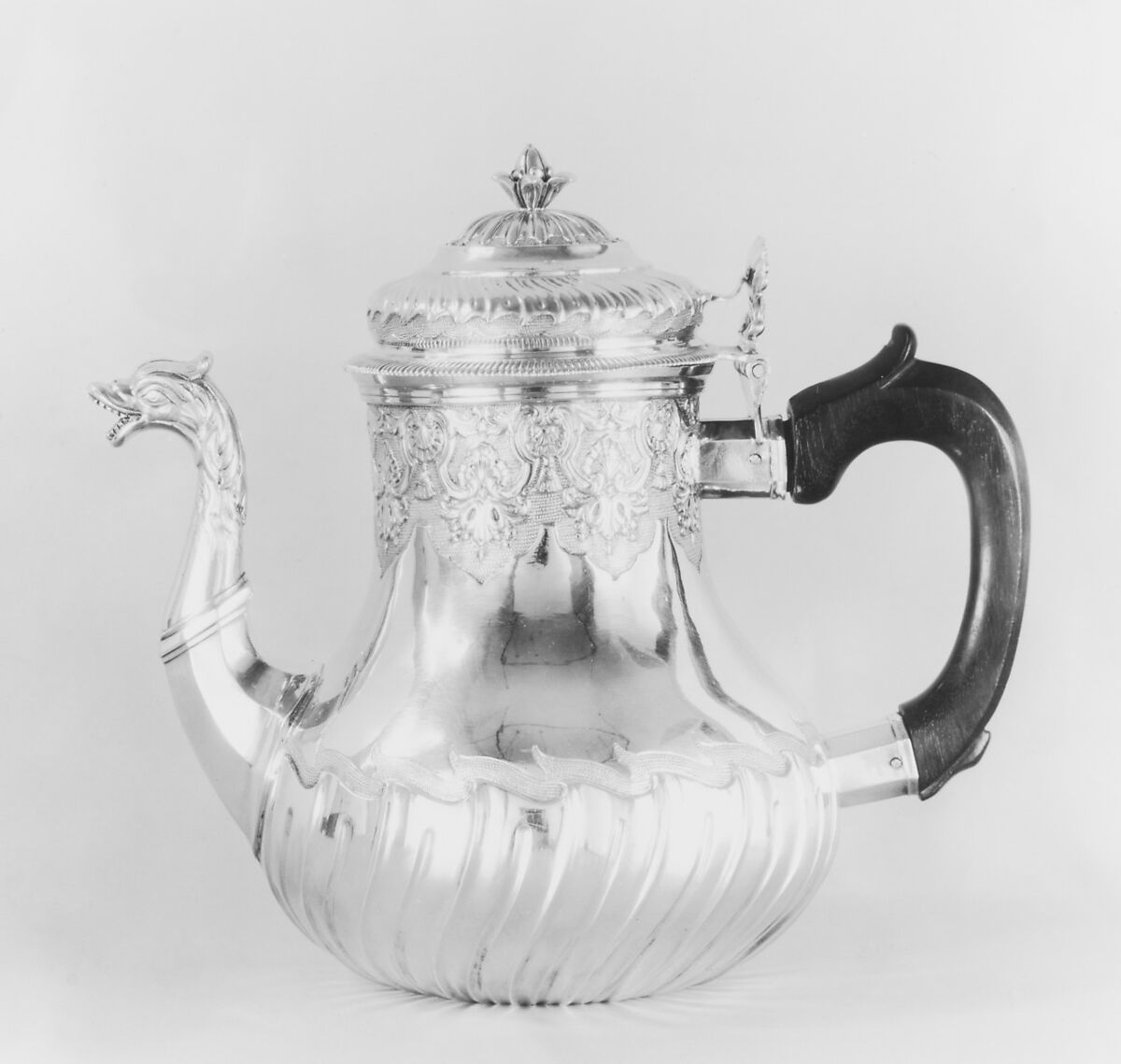 Tea never attained the popularity of chocolate or coffee in France, and relatively few eighteenth-century French silver teapots survive. Most of those that do are northern French. This example, made near the Flemish border, reflects the lingering popularity there of interlaced scrollwork and foliate decoration. These motifs were no longer fashionable in Paris after the 1730s, with the emergence of the Rococo style, which makes a tentative appearance here in the spiral fluting of the base and lid and in the undulating engraved border.