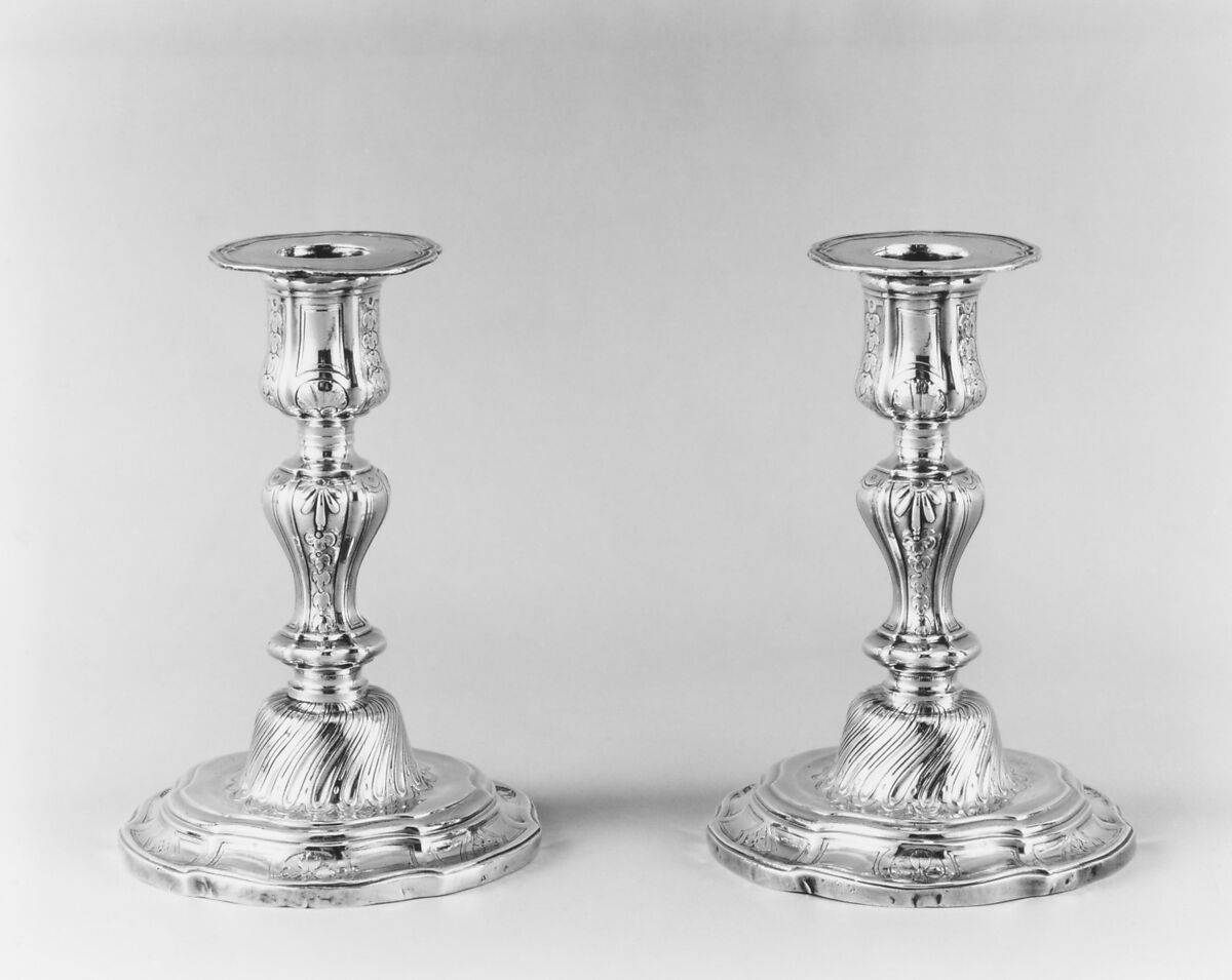 During the late seventeenth and early eighteenth century, the silver toilet set evolved into one of the most fashionable luxury accessories and was an eloquent symbol of the owner’s social status. Intact "garnitures de toilette" are rare but itemized descriptions include a mirror, an ewer and basin, glove trays, various boxes and jars for cosmetics and ointments, scent bottles, and two or sometimes four short candlesticks, besides other objects. Given their small size, this pair of candlesticks is believed to have been part of a toilet set made by the Paris silversmith Joseph Charvet in 1758–59. Their delicate ornament, pronounced curves, and swirling gadrooning all indicate the fully developed Rococo style.