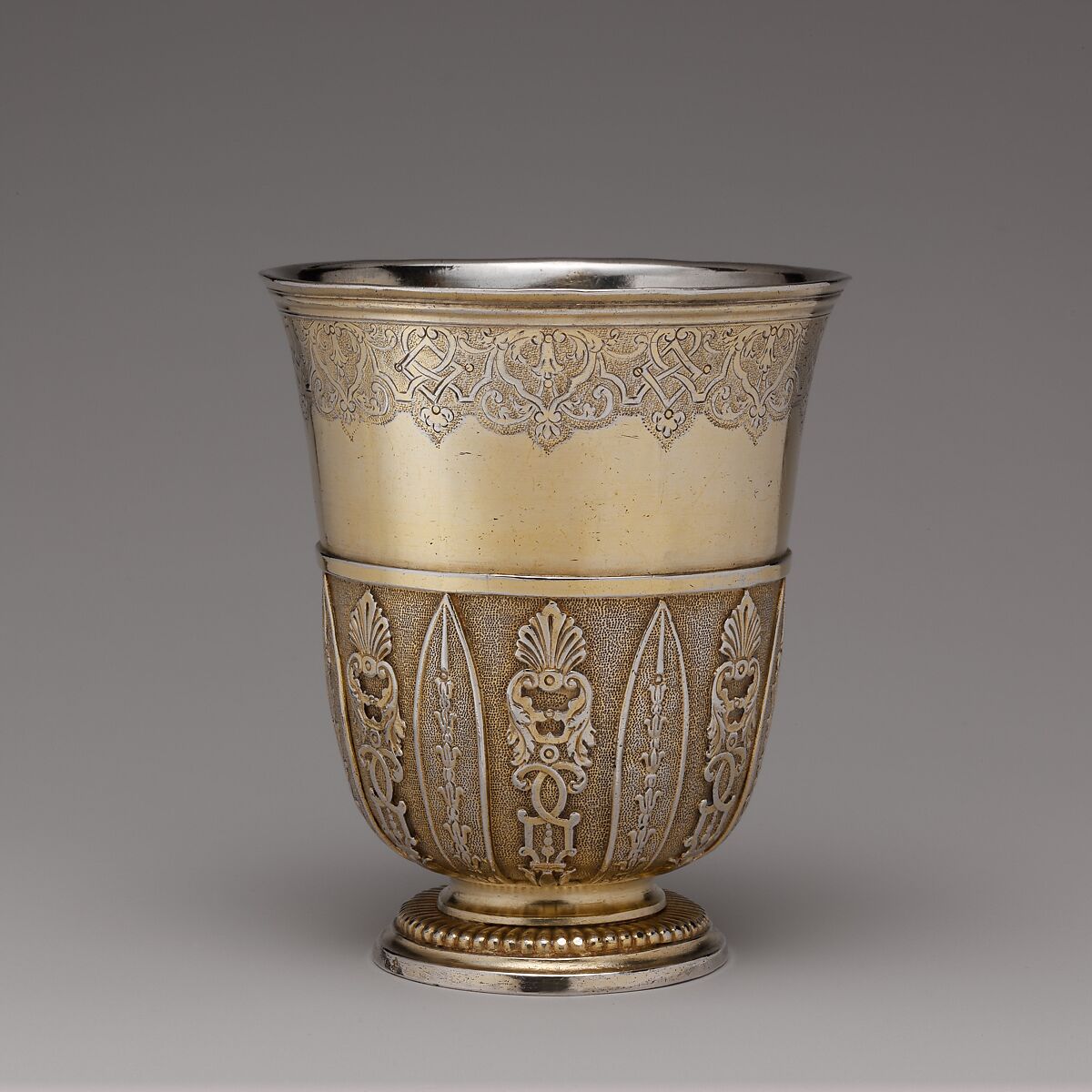Bell or tulip-shaped beakers became the dominant form used throughout France in the first half of the eighteenth century. The decoration frequently consists of Berain-type strapwork, either in relief or engraved, lambrequin engraving around the rim, and gadrooning on the foot.
