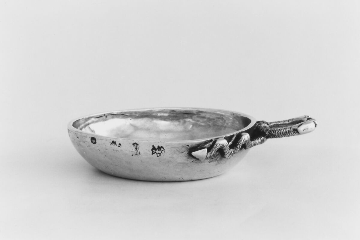 Also known as a tasse à vin, a tâte-vin, or a tastevin, a wine taster was used by a wine merchant to assess the quality, clarity, and color of wine. The reflective properties, resistance to corrosion, and the fact that it would not taint the wine in any way, made silver the ideal material for a winetaster. Shallow in form, these bowls frequently have a convex bottom. The polished surface, either left smooth or embellished with gadrooning and other decorations, would catch the light and reflect it throughout the wine so that it could be checked for impurities. Holding just a small amount of wine, silver wine tasters are often personalized with initials, names, and dates or coats-of-arms. Here the name Auguste Delaire Coste, likely that of a former owner, is engraved on the outside of the plain bowl The looped serpent-shaped handle refers to Dionysus, the god of wine.