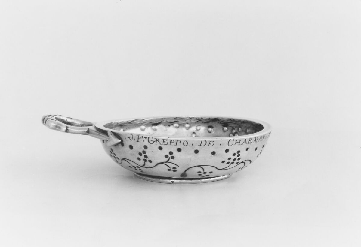 Also known as a tasse à vin, a tâte-vin, or a tastevin, a wine taster was used by a wine merchant to assess the quality, clarity, and color of wine. The reflective properties, resistance to corrosion, and the fact that it would not taint the wine in any way, made silver the ideal material for a winetaster. Shallow in form, these bowls frequently have a convex bottom. The polished surface, either left smooth or embellished with gadrooning and other decorations, would catch the light and reflect it throughout the wine so that it could be checked for impurities. Holding just a small amount of wine, silver wine tasters are often personalized with initials, names, and dates or coats-of-arms. This shallow wine taster on a ring foot, has a loop handle in the form of confronted bird-like heads and arrow-shaped tails. Handles of this type may be a regional characteristic as they are found on wine tasters from Southern Burgundy and Beaujolais. The bowl has punched and incised decoration of grapevines with a single row of punched dots below the rim and a double row in the interior. The outside rim is inscribed with a name and date: J • F • GREPPO • DE CHARNAY 1802