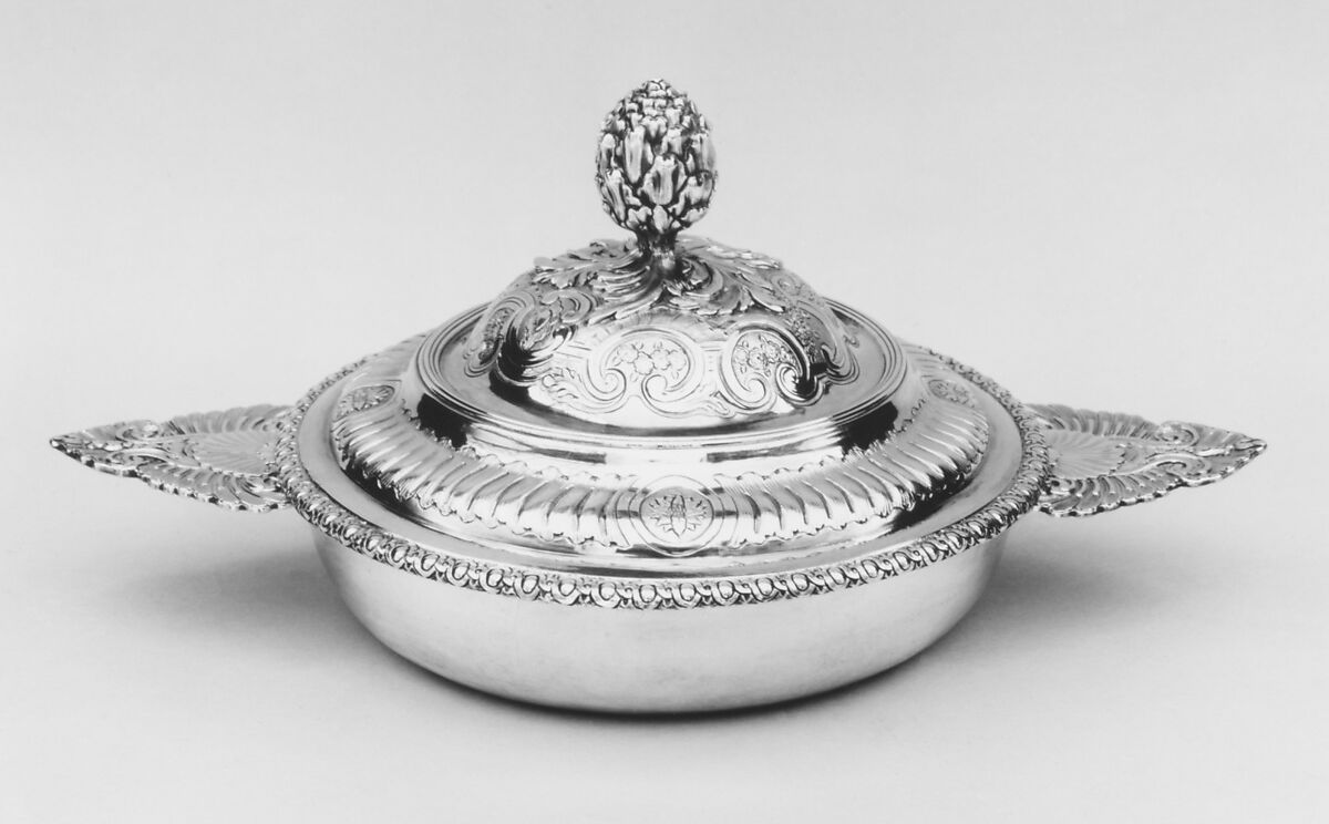An écuelle is a lidded bowl with two handles, often provided with a matching saucer or stand, used for serving hot broth or bouillon. During the late seventeenth and eighteenth century, broth was taken during the morning toilette but also offered to new mothers, as well as to the sick and bed-ridden to regain their strength. For that reason, écuelles were intended for private use in the bedroom rather than in the dining room. The broth bowl could be an independent piece made of faience, porcelain, pewter or silver. As part of an elaborate dressing table set, it was usually made of precious metal.