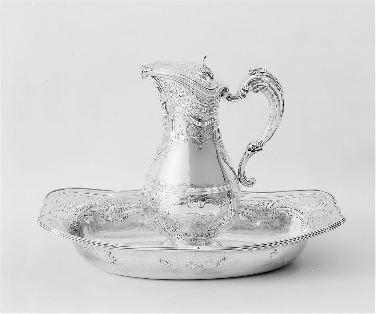A lidded ewer such as this one held warm scented water for washing the hands and face at the beginning of the toilet. Here, the decoration comprises rocailles typical of the period, with flowers in relief and swans alluding to the water contained in the ewer. The undulating lines of the neck of the ewer, its handle, and the profile of the basin as well as the curvilinear forms of the decorative motifs all reflect the influence of the Rococo style.