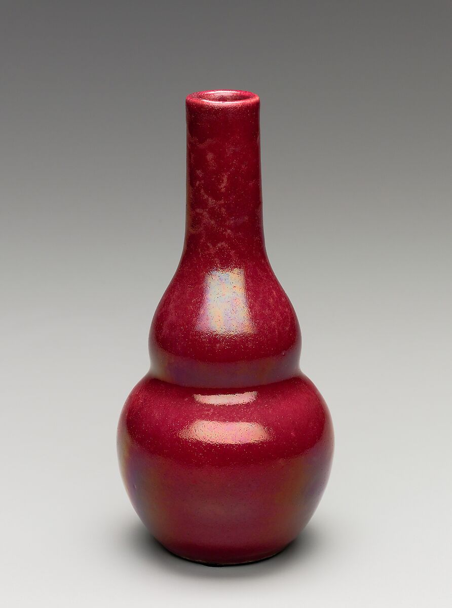 During the 1880s Robertson increasingly turned his attention to developing new glaze formulas and clay bodies. In the middle of the decade he became obsessed with the highly coveted yet elusive sang-de-boeuf, or oxblood, glaze, a quest that became the hallmark of his later career. This richly colored blood-red glaze is traditionally created from a copper-based formula and fired in a kiln, which when wet straw and other materials are introduced, deprives the atmosphere of oxygen and changes the copper-oxide glaze to a brilliant red color. While Chinese potters sporadically created the copper-red glaze in earlier centuries, it was not until the Ming Dynasty (1368– 1644) that ceramists refined the technique to yield consistently good color. However, production was disrupted shortly thereafter, and the secret lost. About 1680 the secret of copper-red glazes was regained, and its production continued through the eighteenth century. In April 1885 Robertson became the first American to successfully replicate the oxblood glaze. Justly proud of his accomplishment, he called the variations of his new glaze "Dragon’s Blood," "Sang de Chelsea," and "Robertson’s Blood." Robertson showcased his new oxblood glazes on the same Chinese-inspired shapes that he used for his monochrome glazes, demonstrated by this double gourd shaped vessel.