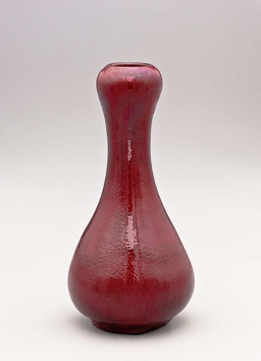 Robertson preferred some of his copper-red glazes over others. In an 1889 letter to Allan Marquand, a distinguished Princeton professor who had a special interest in ceramics, Robertson singled out his "Orange peel Blood as far superior to the smooth," commenting that it was "not so common" and "gives a richer and more varied effect." The richness that Robertson observed is seen on this vase with a subtly pitted texture that indeed resembles the skin of an orange, a characteristic of some Chinese glazes.