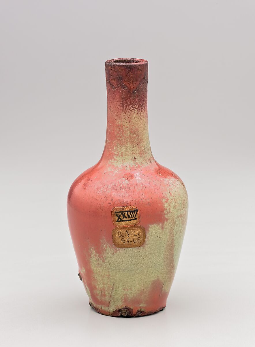 In April 1885 Robertson became the first American to successfully replicate the oxblood glaze, showcasing his new oxblood glazes on the same Chinese-inspired shapes that he used for his monochrome glazes. Justly proud of his accomplishment, he called the variations of his new glaze "Dragon’s Blood," "Sang de Chelsea," and "Robertson’s Blood." In 1887 Robertson observed that in his "struggle to master the Blood," he "met a number of variations that are very pleasing in effect and intirely [sic] new as far as I know." The extraordinary holdings of Chelsea sang-de-boeuf vessels in the Ellison Collection at the Metropolitan Museum of Art include many modulations of color, varying from crimson to fiery orange reds, tones of bright raspberry, and dark, sonorous reds with a purplish cast.