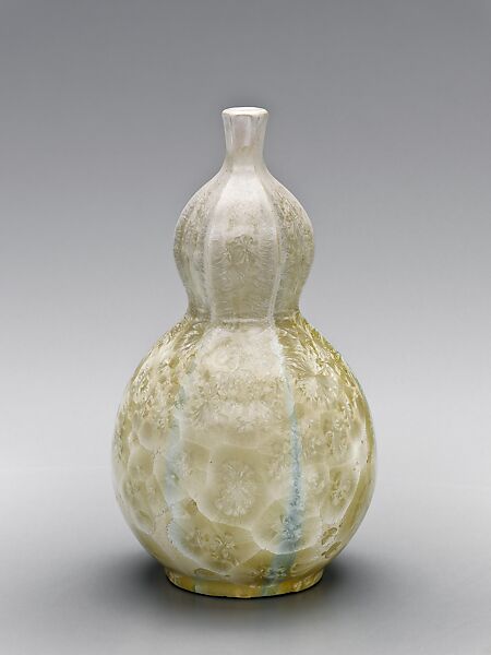The pottery established at University City, outside of Saint Louis, Missouri, was the brainchild of visionary Edward Gardner Lewis. He sought to experiment with a new approach to women’s education, which included publishing a journal and offering mail-order classes. To launch his pottery enterprise, Lewis lured Taxile Doat, the eminent French ceramist from Sèvres; Adelaide Alsop Robineau, master porcelain artist from Syracuse, New York, and her husband, Samuel; and English –born potter Frederick Hurten Rhead to University City. Having discovered a vein of kaolin clay (the key ingredient for porcelain) during the excavation for Lewis’s publishing headquarters, he decided that the pottery would exclusively focus on porcelain. The intimate environment of these superbly talented potters fostered close collaboration among the artists there. Unfortunately, University City’s Utopian ideals proved impossible to sustain, and the principle ceramists disbanded in the Spring of 1911. Later that year, however, the pottery reorganized and Doat returned to University. Although he continued to create some elaborately decorated showpieces, most of the production concentrated on cast forms, many recalling shapes Doat had produced at Sèvres. They generally featured seductive, often shimmering crystalline glazes. This double-gourd shaped vase, with its subtle crystalline glazes, exemplifies the sophisticated glazes that characterize the work of University City. In a promotional pamphlet of about 1914 the pottery claimed: "No two pieces are alike in Crystallization nor can any of the high fire Crystalline pieces to be sold be duplicated, each piece offered being an exclusive gem of the high temperature at which it is produced." Dated 1913, it also bears Doat’s initials, a likely indication that he ware responsible for the design of the original form.