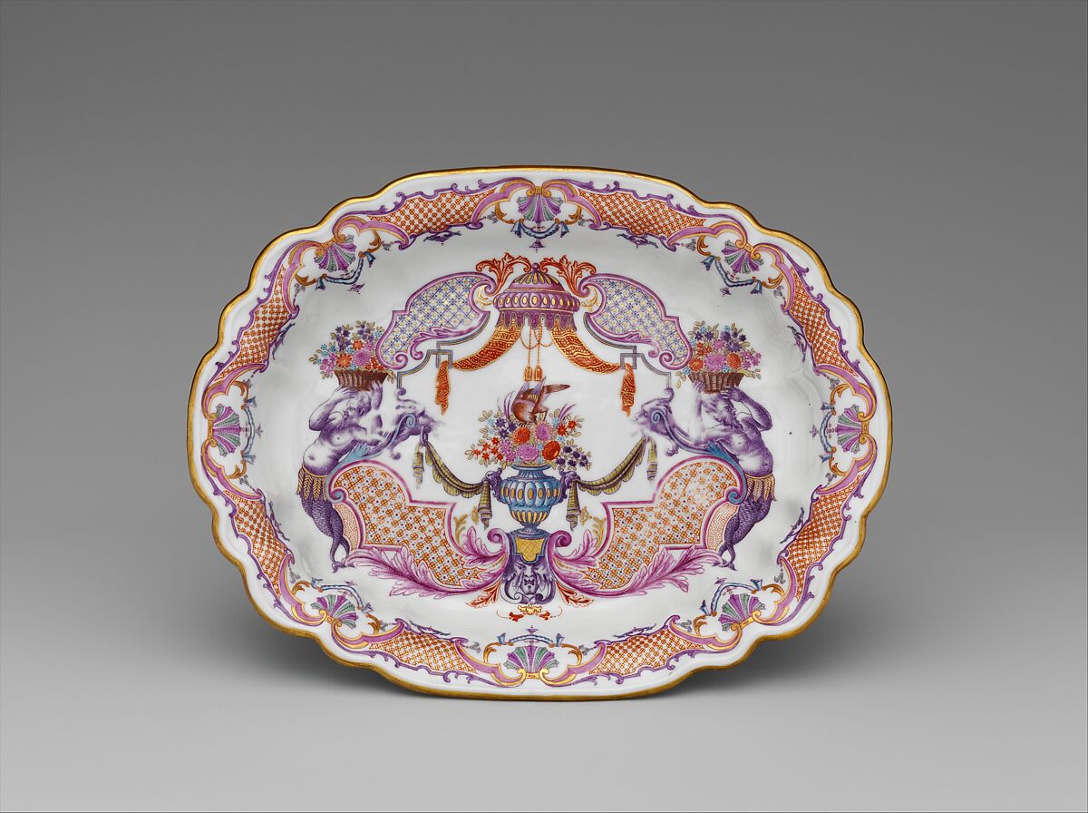 The elaborate decorative scheme on this stand and the skill with which it is painted are enhanced by the subtle but extensive use of gilding. Gold has been employed to highlight the trelliswork in particular, as well as other compositional elements, including the baldachin and the swags below, the central urn, and even the decorative drapery worn by the tritons. Though many works produced at the factory are decorated with a minimal amount of gilding, the generous use of gold on this stand is an indication of the ambitiousness of its decoration. This stand is one of three very similar small oval shallow dishes, all of which are believed to have served as stands for small tureens.[4] It is notable that the decoration of the center of each of the three stands is finely painted and sophisticated in composition, owing to the fact that each would have been largely obscured by the small tureen placed on top.