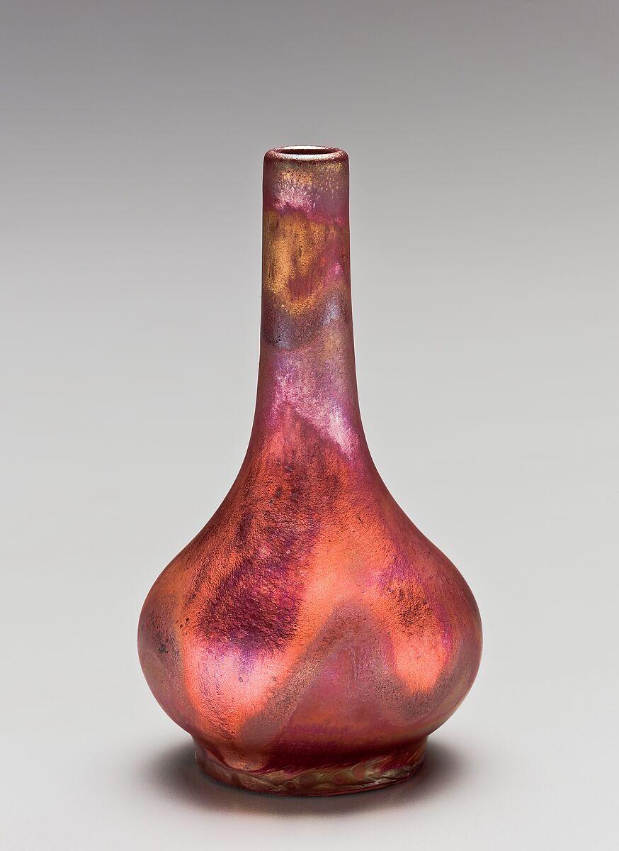 During the 1880s Robertson increasingly turned his attention to developing new glaze formulas and clay bodies. In the middle of the decade he became obsessed with the highly coveted yet elusive sang-de-boeuf, or oxblood, glaze, a quest that became the hallmark of his later career. This richly colored blood-red glaze is traditionally created from a copper-based formula and fired in a kiln, which when wet straw and other materials are introduced, deprives the atmosphere of oxygen and changes the copper-oxide glaze to a brilliant red color. While Chinese potters sporadically created the copper-red glaze in earlier centuries, it was not until the Ming Dynasty (1368– 1644) that ceramists refined the technique to yield consistently good color. However, production was disrupted shortly thereafter, and the secret lost. About 1680 the secret of copper-red glazes was regained, and its production continued through the eighteenth century. In April 1885 Robertson became the first American to successfully replicate the oxblood glaze. Justly proud of his accomplishment, he called the variations of his new glaze "Dragon’s Blood," "Sang de Chelsea," and "Robertson’s Blood." Robertson showcased his new oxblood glazes on the same Chinese-inspired shapes that he used for his monochrome glazes. This small, bottle-shaped is enveloped with a lustrous, almost iridescent sang-de-boeuf glaze. Similarly, the pottery’s double gourd and bulbous shapes, all straightforwardly Chinese in inspiration, were covered with oxblood red. While Robertson’s other shapes were variants of standard Chinese forms, there was a subtle progression away from specific Eastern precedents toward simpler, non-historicizing forms.