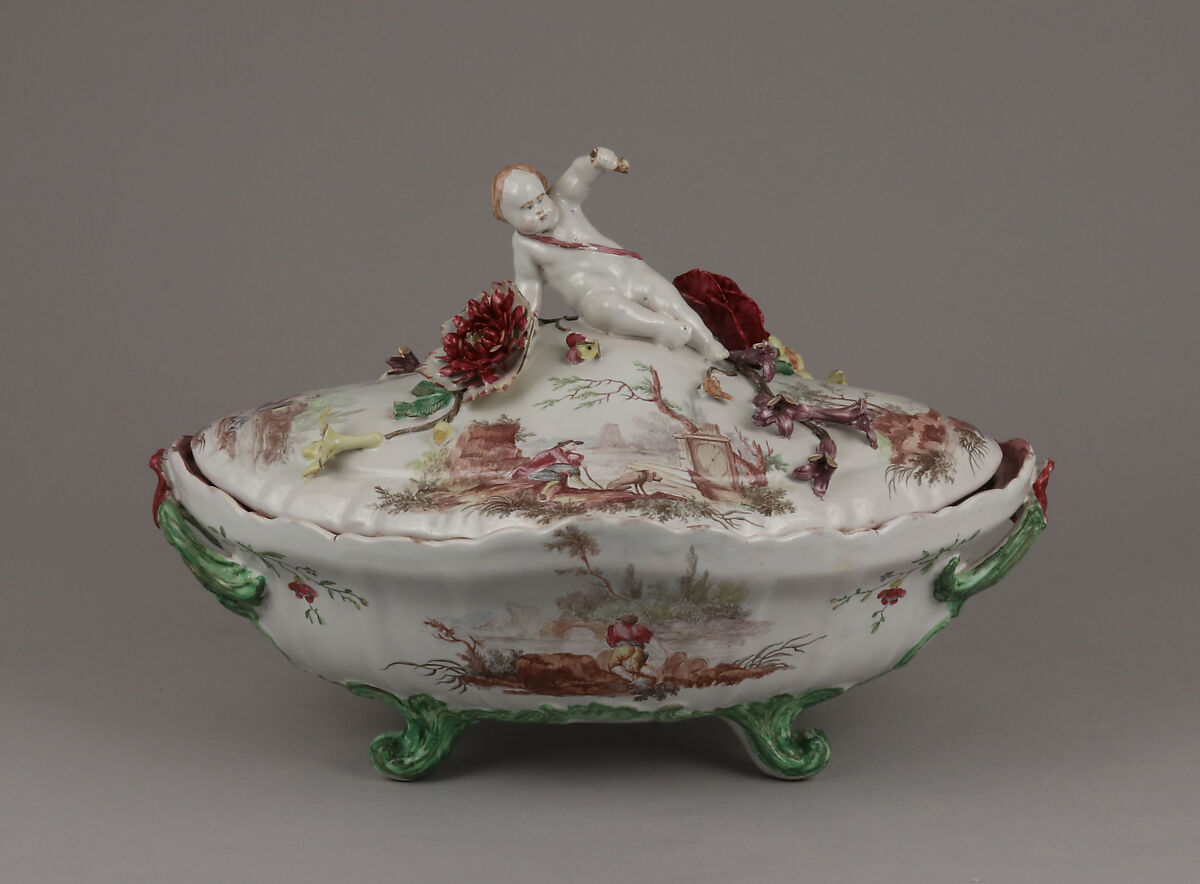 Faience, or tin-glazed and enameled earthenware, first emerged in France during the sixteenth century, reaching widespread usage among elite patrons during the seventeenth and early eighteenth centuries, prior to the establishment of soft-paste porcelain factories. Although characterized as more provincial in style than porcelain, French faience was used at the court of Louis XIV as part of elaborate meals and displays, with large-scale vessels incorporated into the Baroque garden designs of Versailles. Earlier examples of French faience attest to the strong influence of maiolica artists from Italy. Later works demonstrate the ways in which cities such as Nevers, Rouen, Lyon, Moustiers, and Marseille developed innovative vessel shapes and decorative motifs prized among collectors throughout Europe.