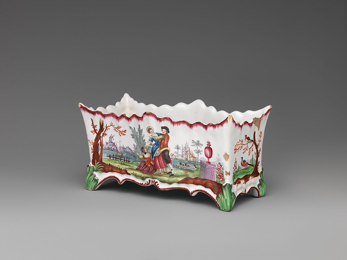 Faience, or tin-glazed and enameled earthenware, first emerged in France during the sixteenth century, reaching widespread usage among elite patrons during the seventeenth and early eighteenth centuries, prior to the establishment of soft-paste porcelain factories. Although characterized as more provincial in style than porcelain, French faience was used at the court of Louis XIV as part of elaborate meals and displays, with large-scale vessels incorporated into the Baroque garden designs of Versailles. Earlier examples of French faience attest to the strong influence of maiolica artists from Italy. Later works demonstrate the ways in which cities such as Nevers, Rouen, Lyon, Moustiers, and Marseille developed innovative vessel shapes and decorative motifs prized among collectors throughout Europe.